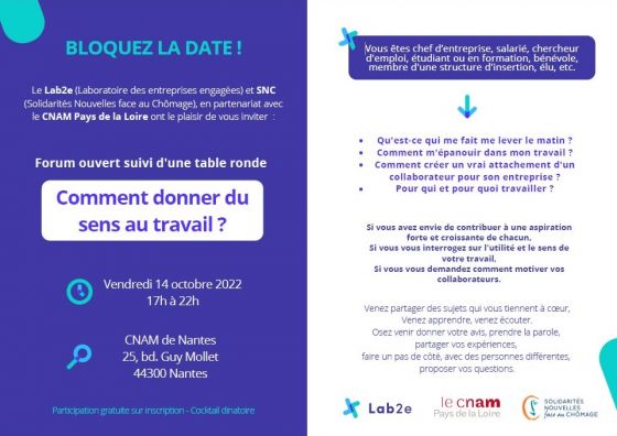Alors nous avons envie de la mettre en partage avec vous au cours d’un forum ouvert organisé par SNC/Lab2E en partenariat avec le CNAM Pays de la Loire